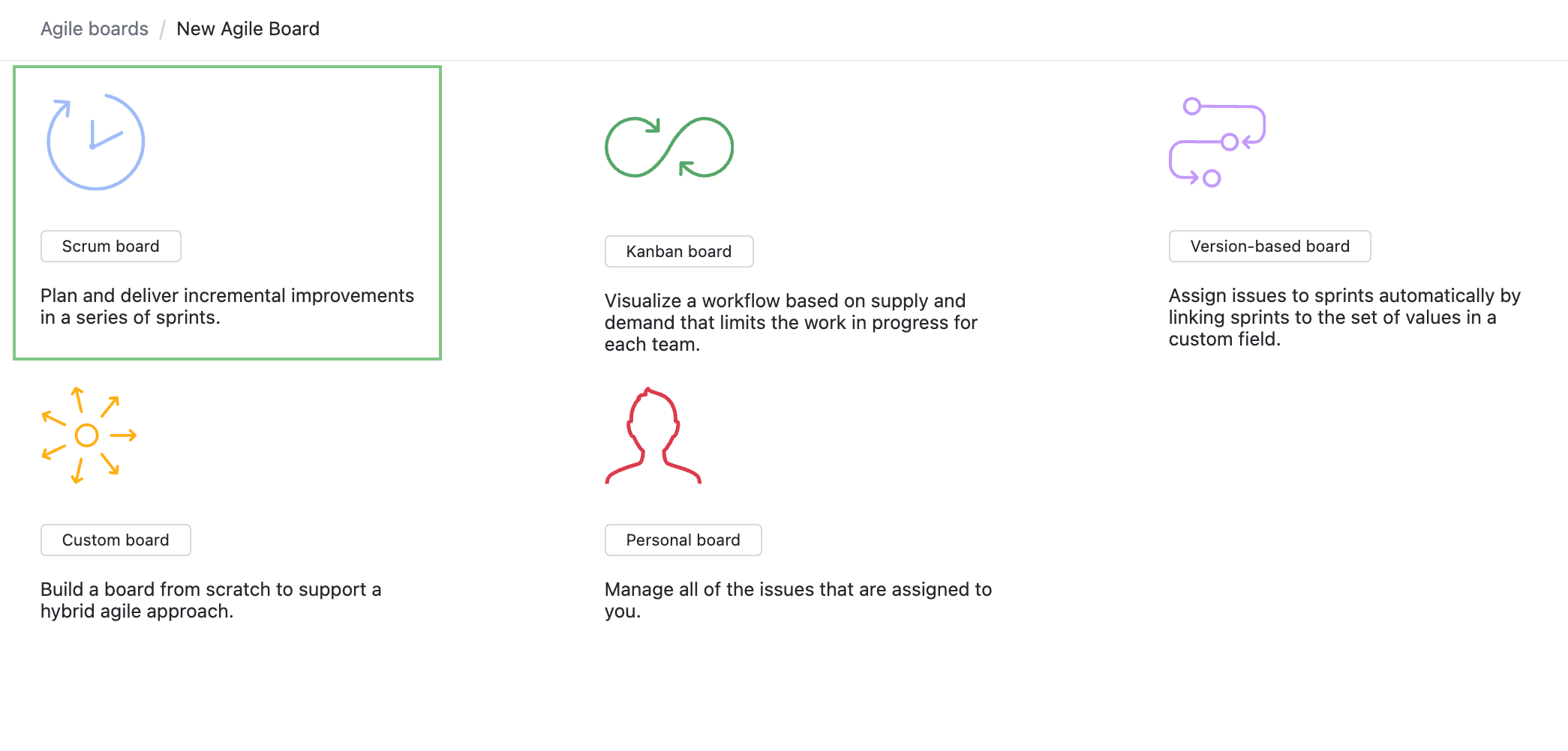 If you're starting a new project and want to configure your agile boards as described here, use the Scrum Project Template. This template configures your project with issue types for epics, user stories, and tasks. It also creates two agile boards automatically β one for managing epics and user stories and another for user stories and tasks.