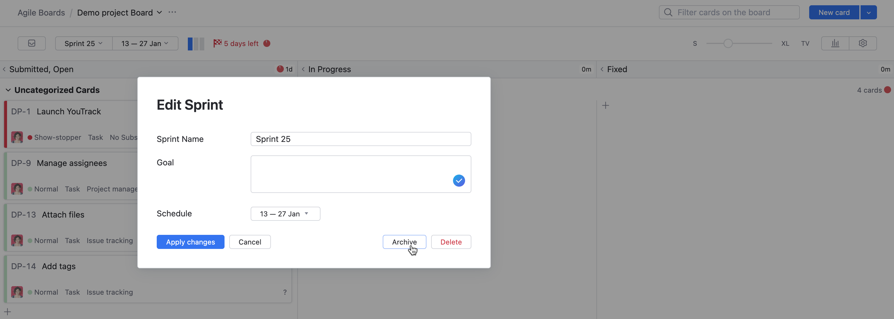 When a sprint is no longer relevant to your current efforts, you can archive it. Archived sprints appear in a separate section of the sprint selection menu on the agile board.