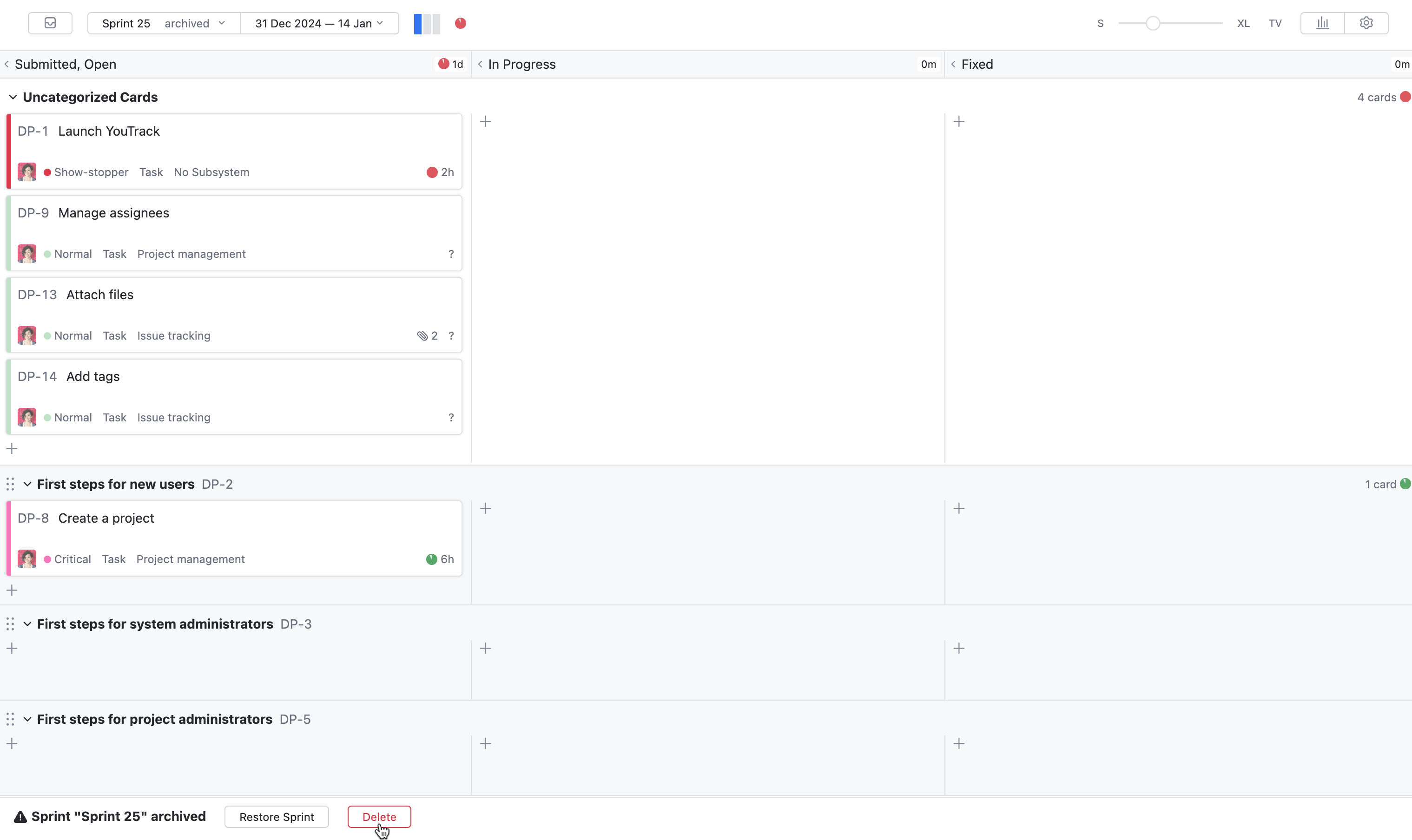 If, for example, you have abandoned the efforts that are associated with a specific sprint, you can delete it. Deleting a sprint removes the entity completely from the database. After deletion: