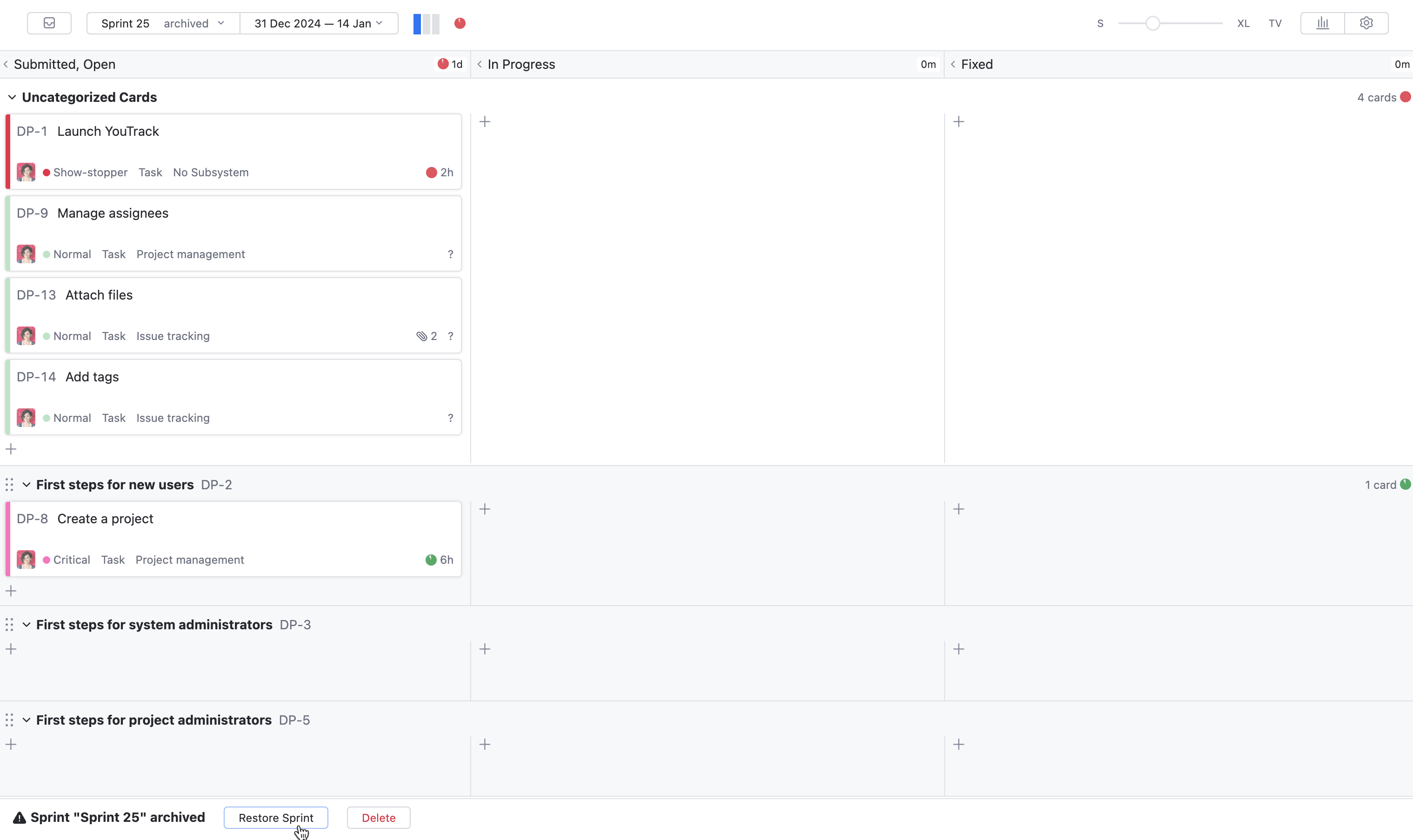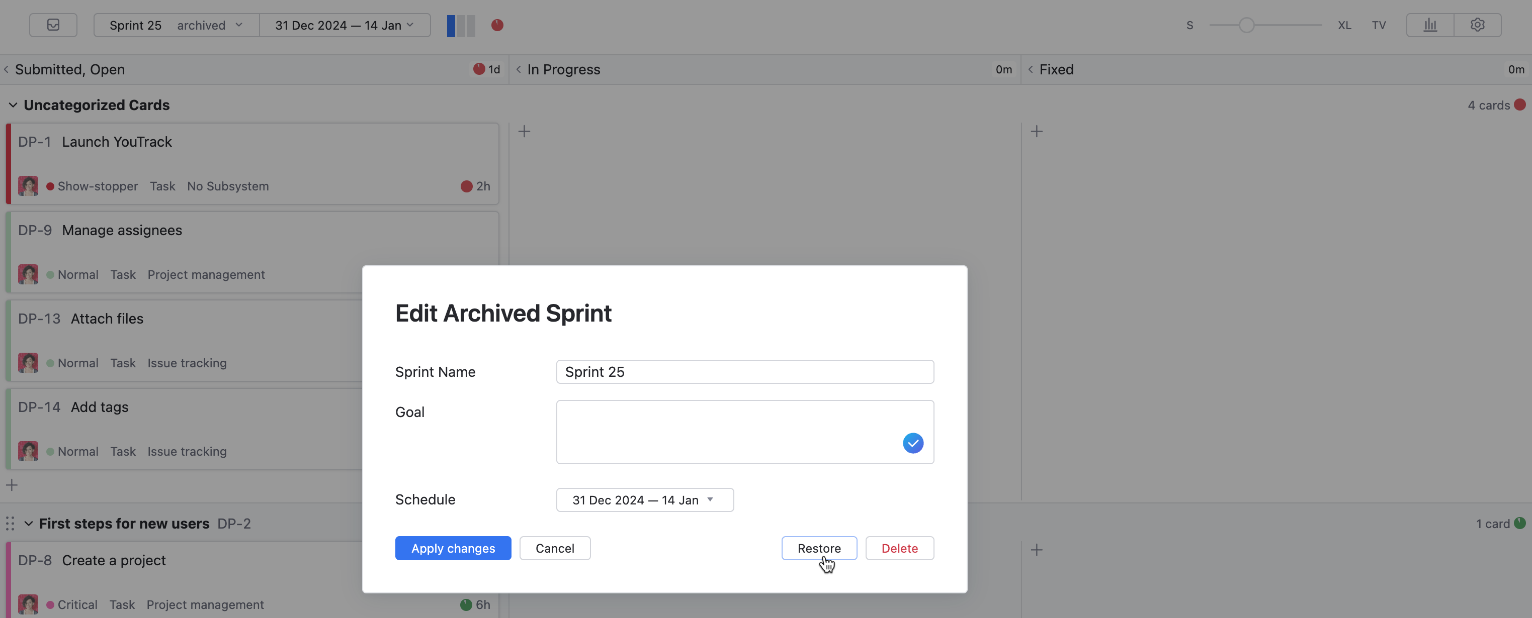 You might choose to restore a sprint when, for example, you decide to postpone the start date for your next sprint and have already archived the current sprint. In this case, you can restore the archived sprint and update its properties to extend the sprint deadline.