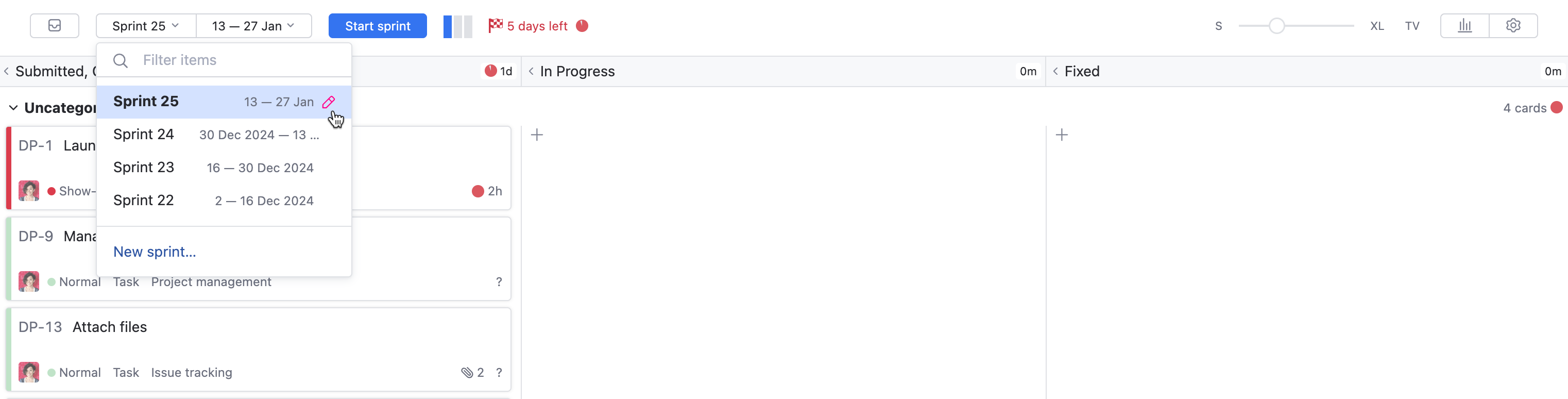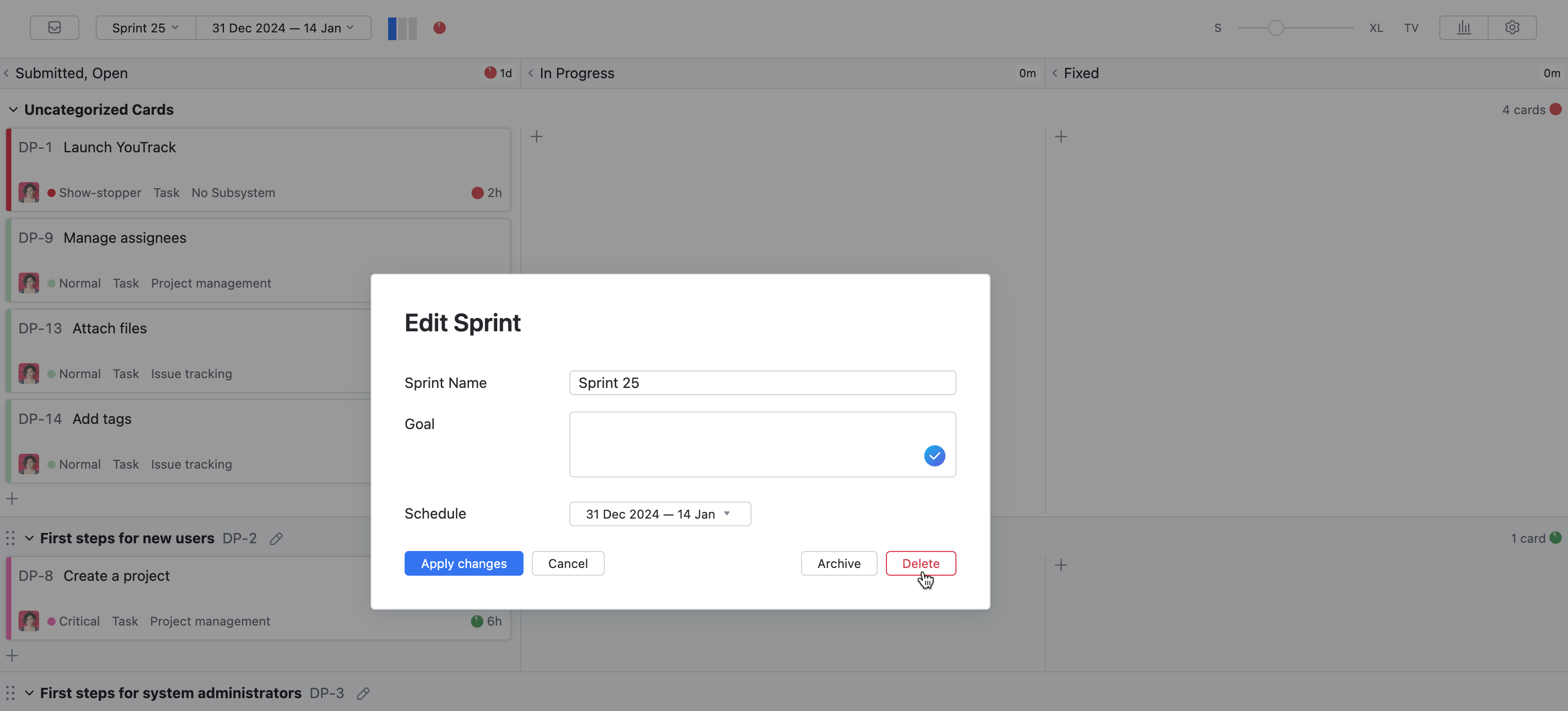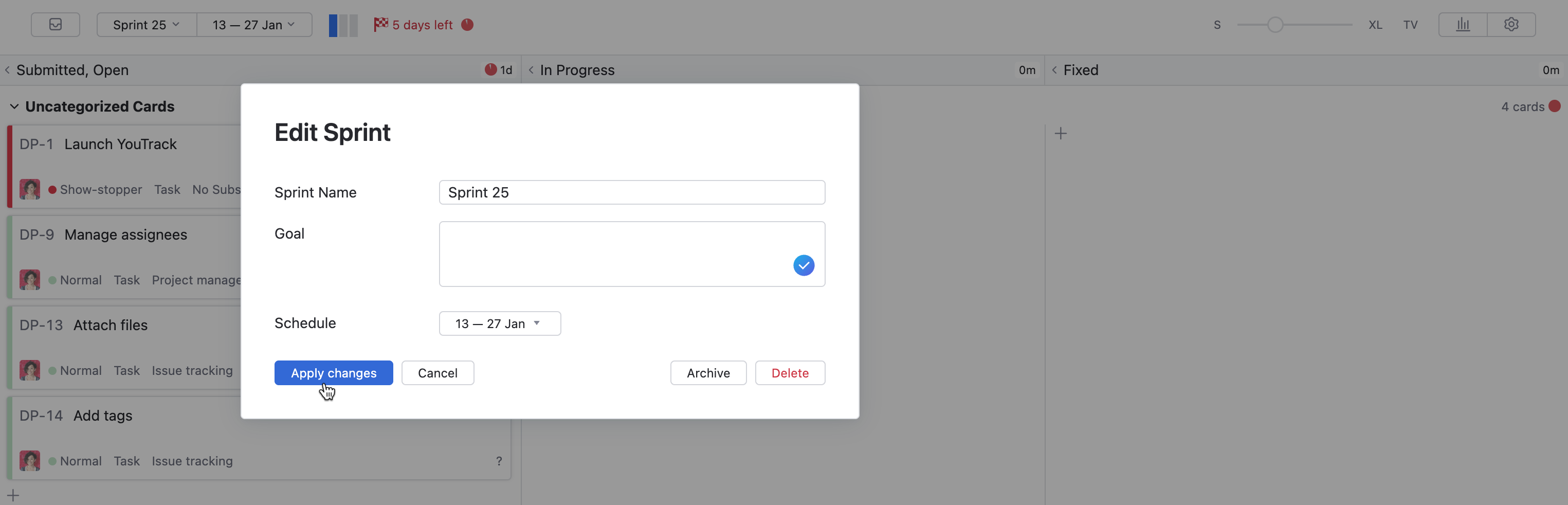 No matter how smoothly you manage your process, the time will come when you need to make a change or two. YouTrack gives you several options for managing sprints after they have been created: