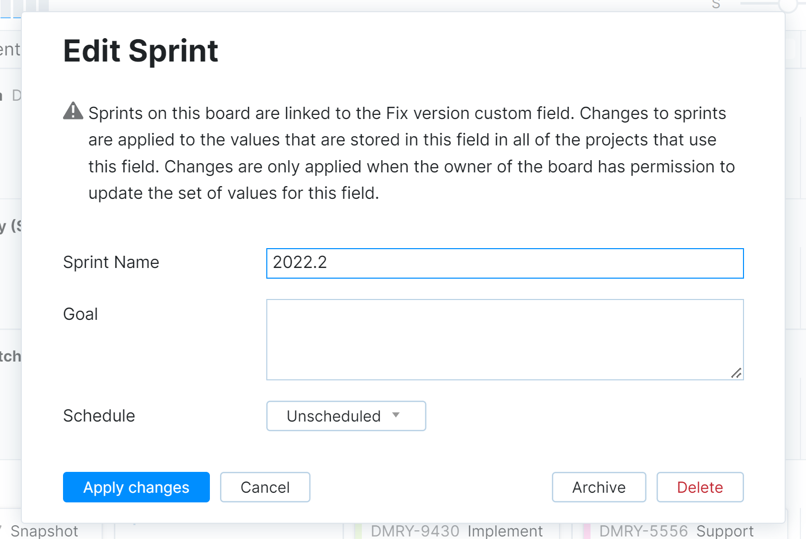 This is because the changes to sprints are applied to the values that are stored in the linked field in all the projects that use it. If your board is configured to link sprints to a custom field, these requirements are shown in the dialogs that let you manage sprints.