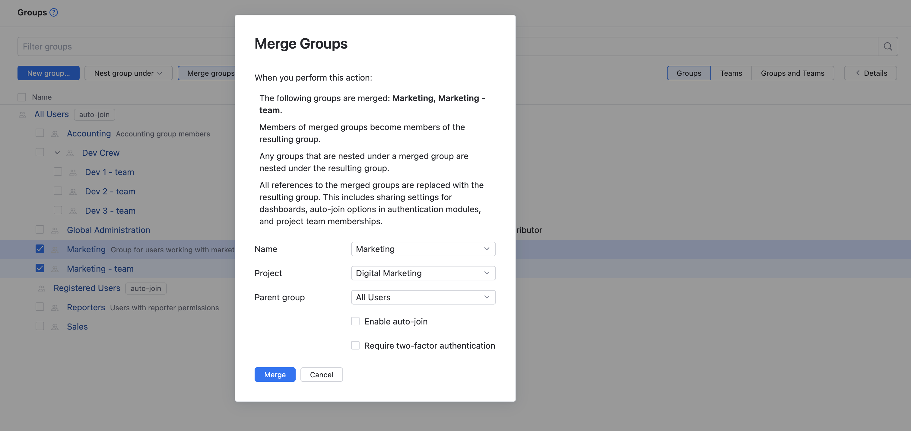 When you have organizational changes or encounter groups with overlapping access rights, you can merge one or more groups into a single group. This action is available on the Groups page.