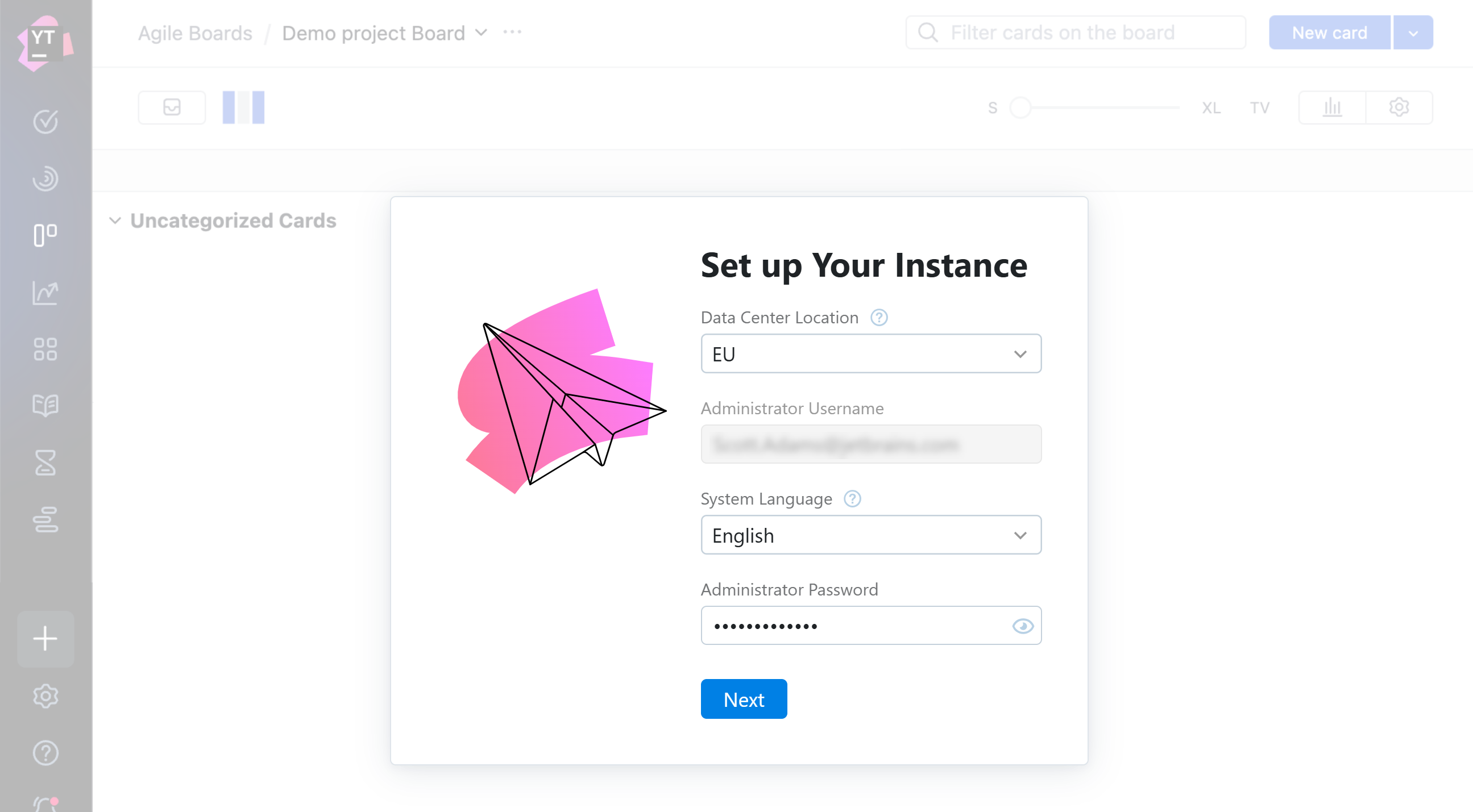 The process for setting up a new YouTrack Cloud instance is simple. Whether you start using YouTrack for free or jump straight into a commercial subscription, all you need to do is register.