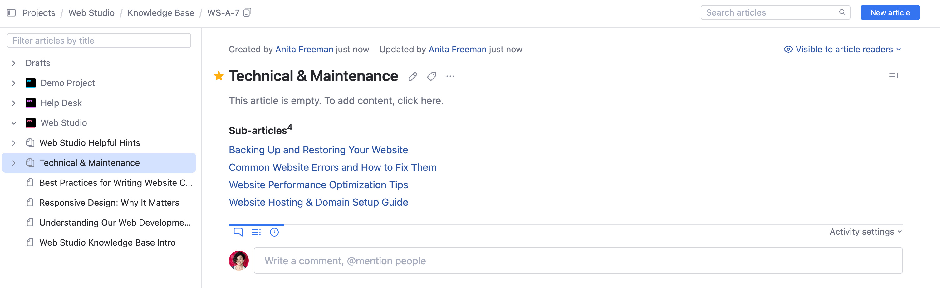 Parent articles don't necessarily have to contain content of their own — you can also use them as containers for adding sub-articles.