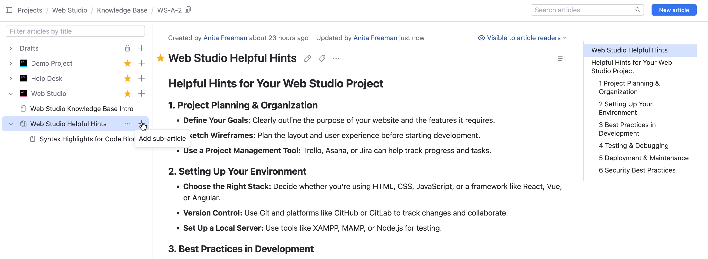 Sub-articles appear nested under their parent, providing a visual hierarchy similar to folders and subfolders. This makes it easy for users to navigate related content.