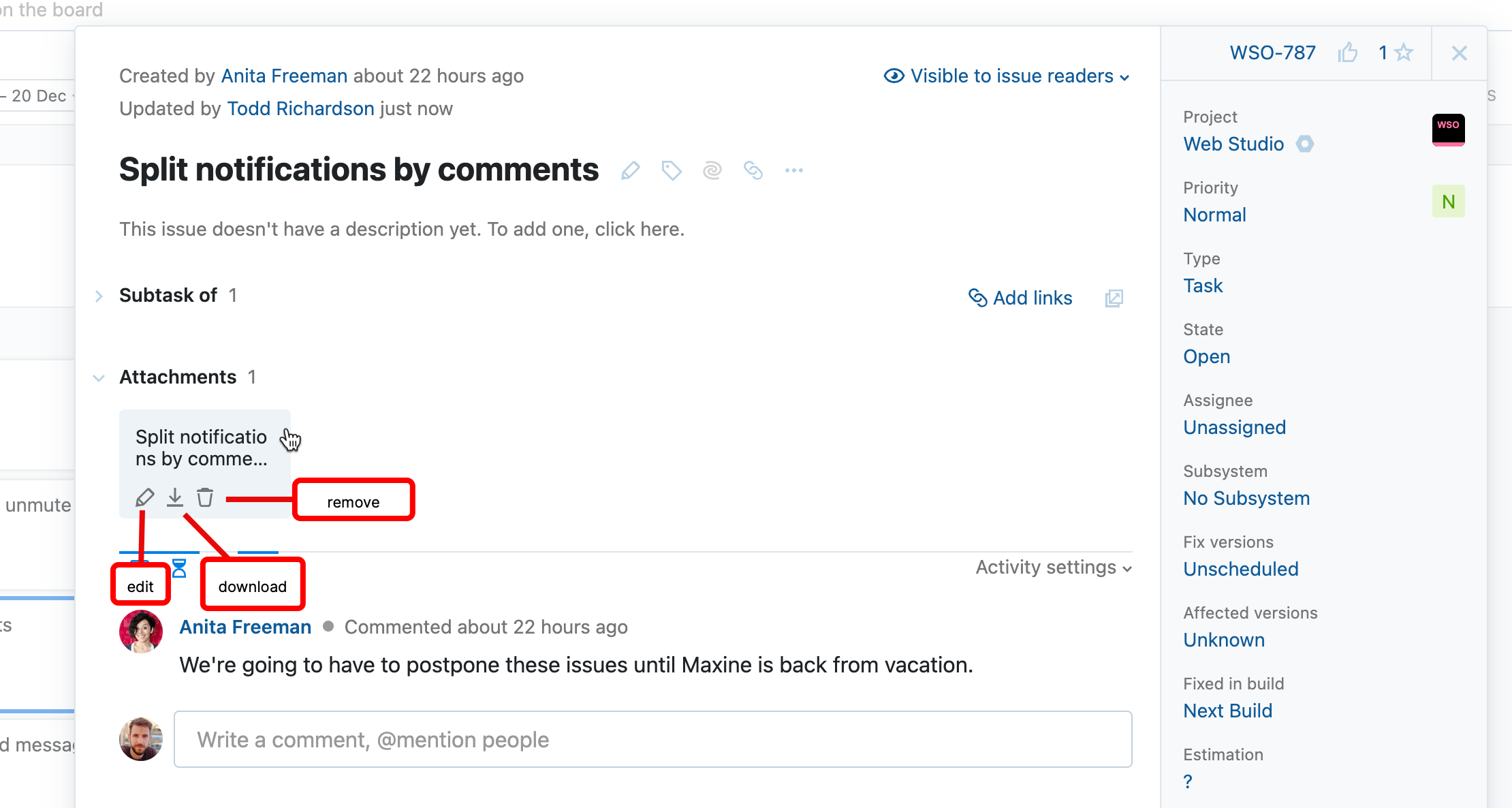 In this issue view, all changes applied to an issue are displayed as a single feed with filters that let you select which types of changes you want to show or hide.