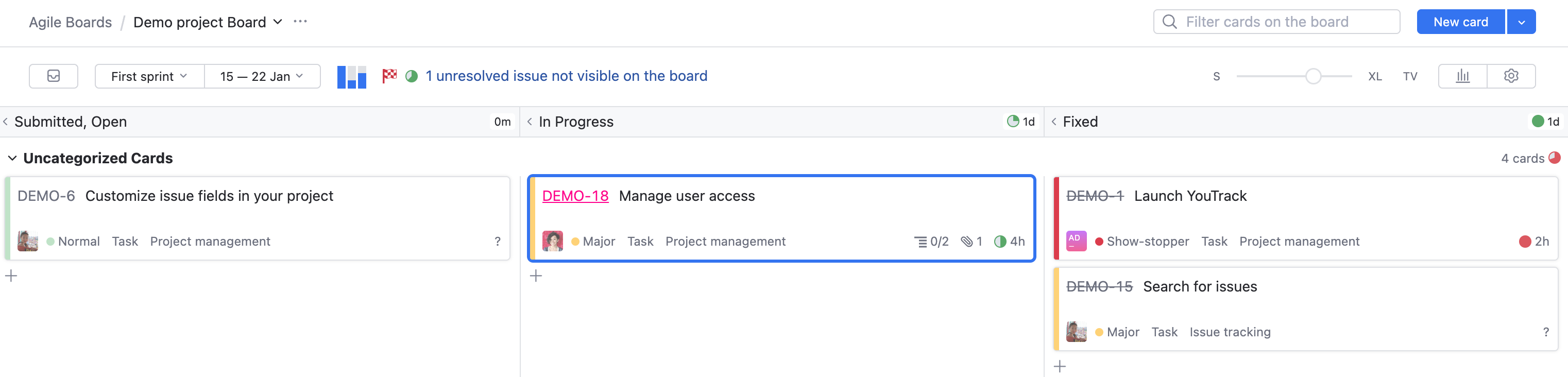 The first thing you'll notice is that issues are transformed into interactive cards that you can move around the board. When you move a card to another position on the board, the values that represent the new column or swimlane are updated in the fields that identify these positions on the board.