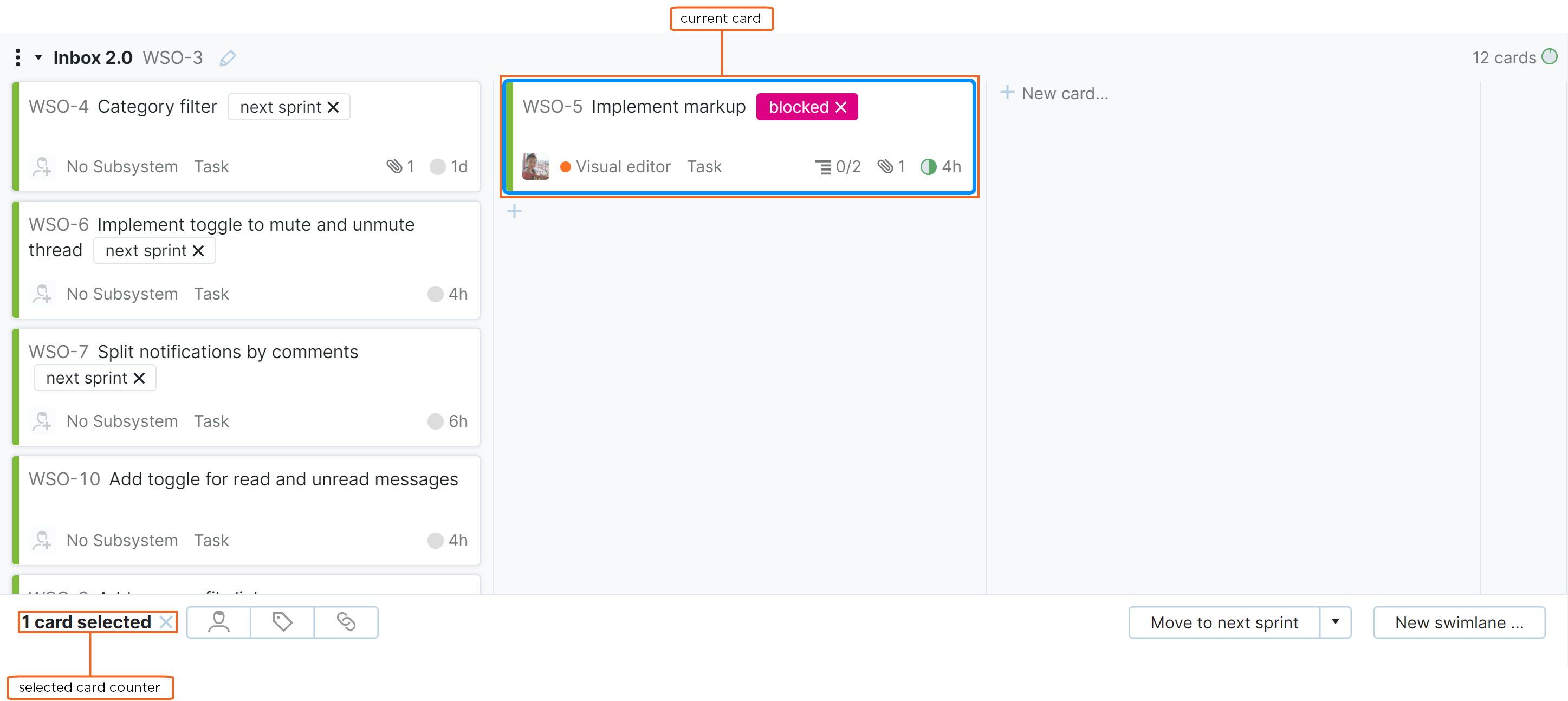 • Click a card or use the arrow keys to select an issue. The current issue is marked with a blue border. As long as you don't select another issue, updates are applied to the current issue.