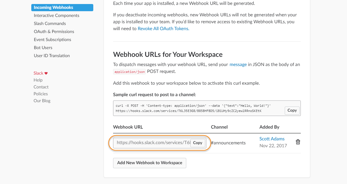 A WebHook URL is added to your workspace.