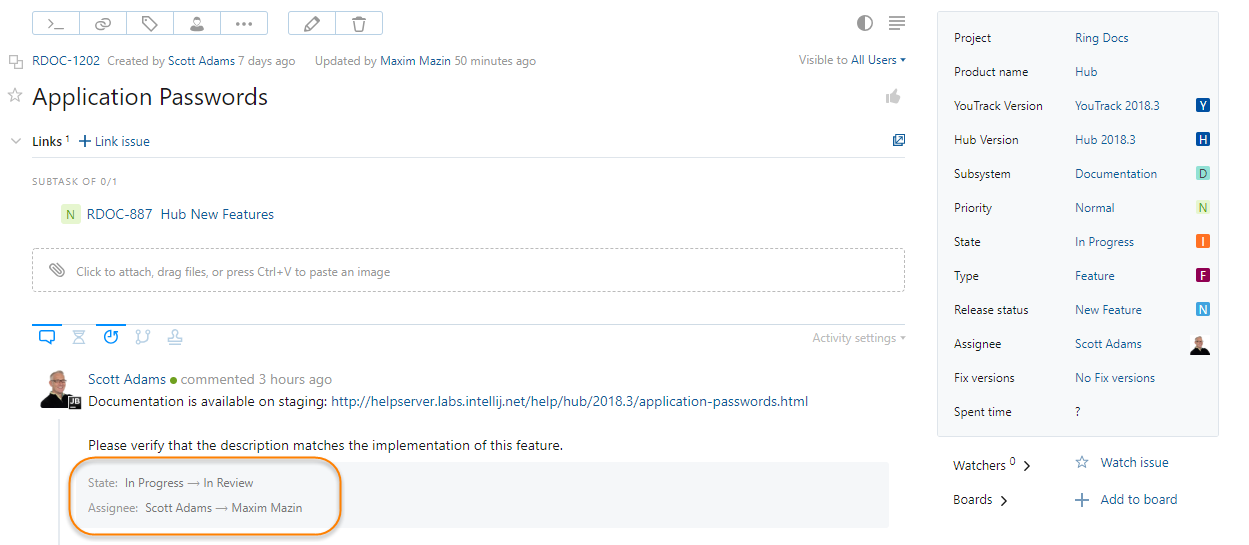 Any commands that apply updates to the issue are shown alongside the comment. For more information, read the Comment-related Updates section below.