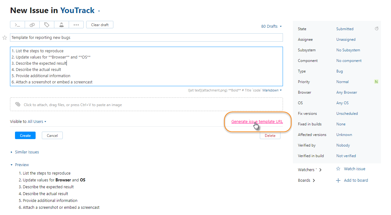 This feature lets you set the custom fields and provide instructions for entering the issue description, then generate a link that stores this information. You can forward this link to a customer or colleague, post it on your website, or simply bookmark it for personal use.