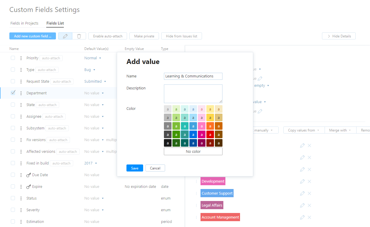 Optionally, select a color scheme (a combination of background and text colors). For example, for a set of values in the Priorities field, you can opt to highlight Critical and Show-stopper values in red.