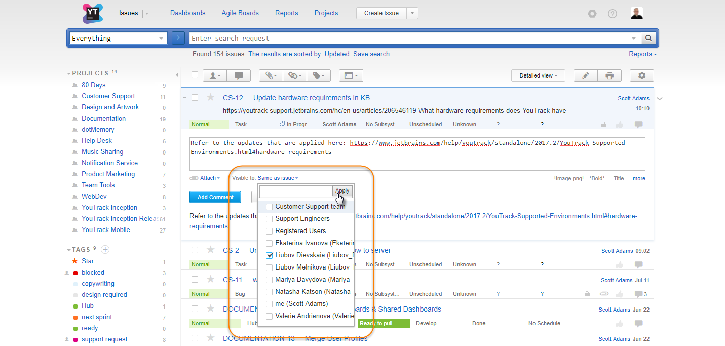 The second type is visible when you add comments to issues in single issue view, on an agile board, or when you apply a command from either of these views. With this control, you only need to select or deselect users and groups. The selection is applied automatically.