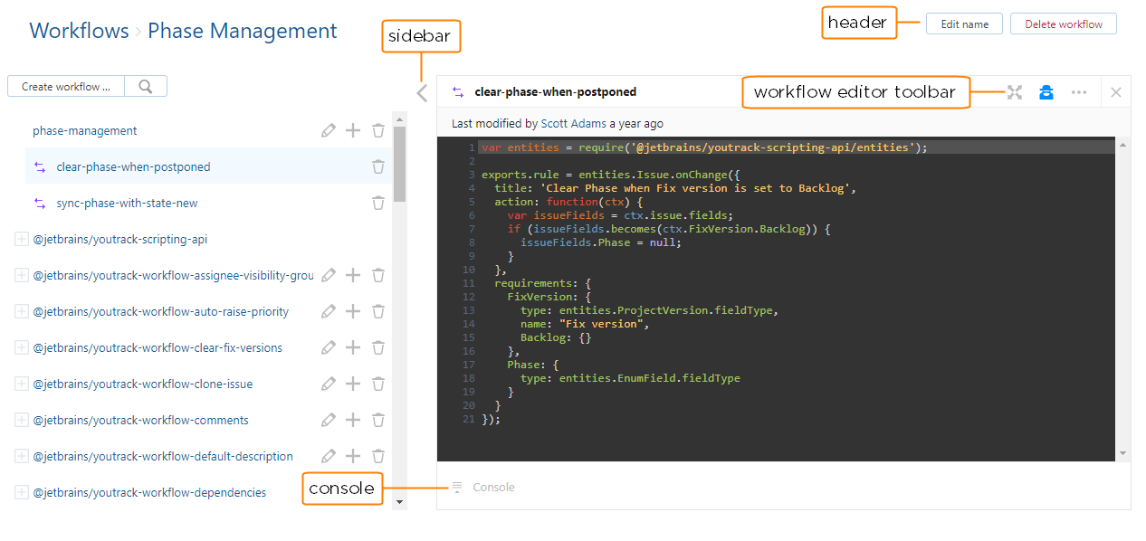 To the left of the editor is a sidebar. In this sidebar, you can view the list of workflows and modules that are written in JavaScript. The list contains all of the default workflows and the custom workflows that your organization has added to YouTrack. System workflows and workflow API modules are also shown in the sidebar and are read only. The following workflows are read only: