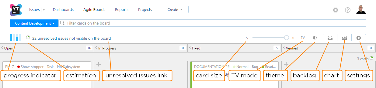 The following controls and visual indicators are displayed in the toolbar for all agile boards.