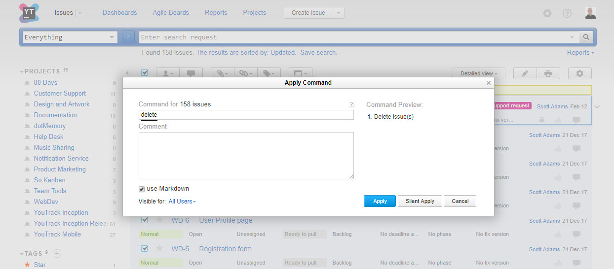 You also have the ability to delete multiple issues at once with commands. You should be very careful when performing this action, as you can select more issues than can be displayed on the Issues list and delete them in one go. Proceed with caution!