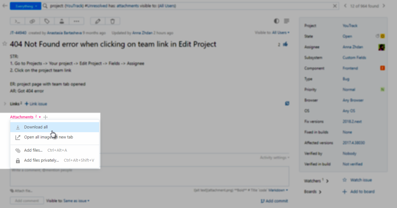 Download all | Just like you'd expect, this downloads all of the files that are attached to the issue to your local directory as a ZIP archive. |