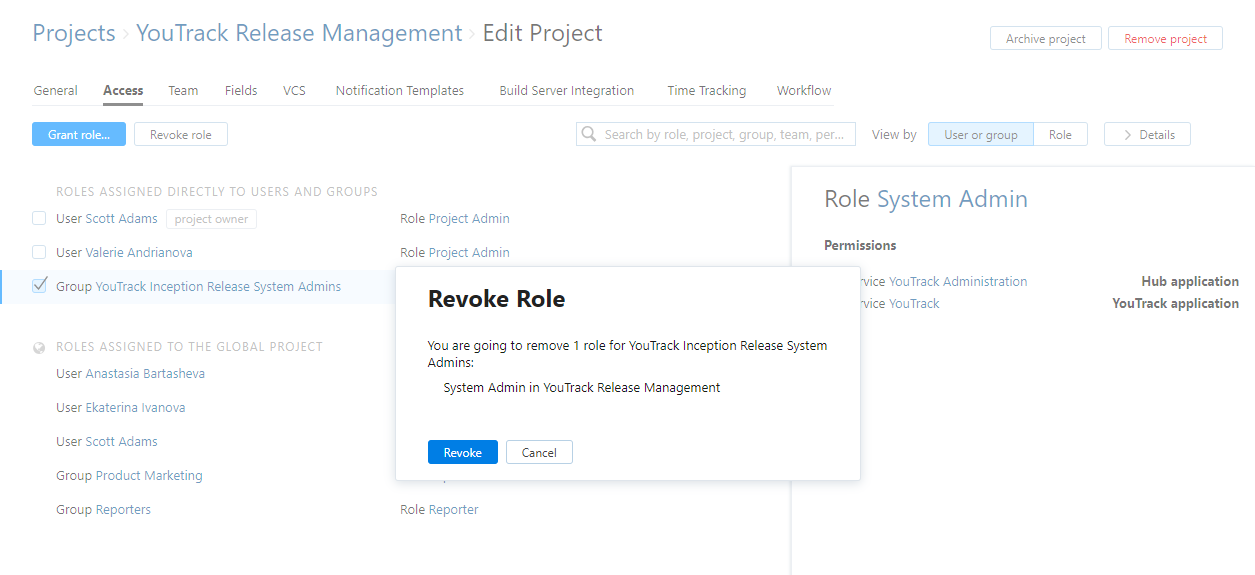 The selected users and/or groups are removed from the project team.