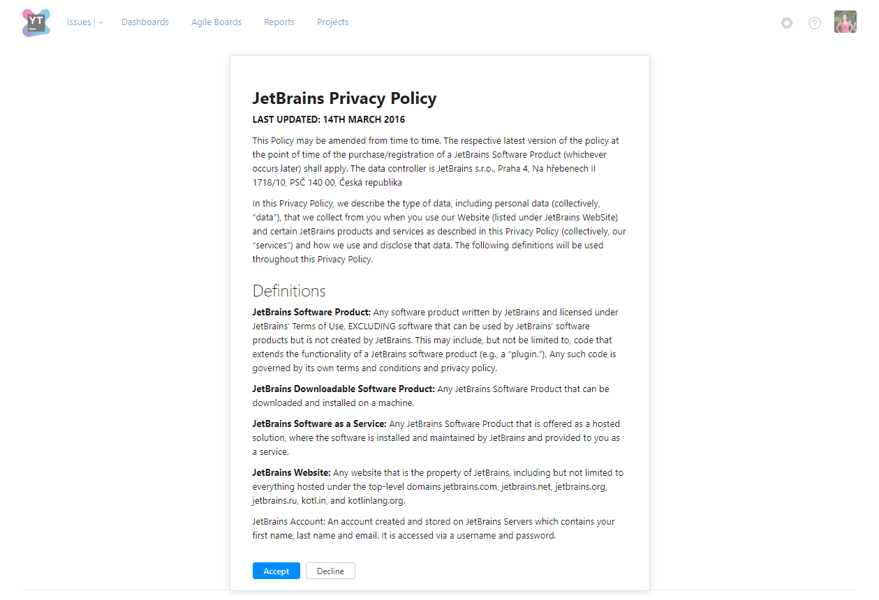 If a user declines the agreement, the user is logged out of YouTrack. To access the service, the user must log in again and accept the agreement.