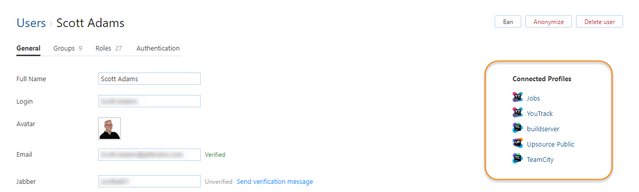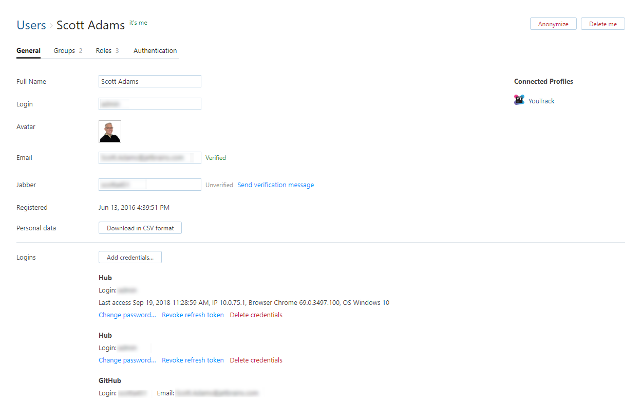 The General tab of the Hub account displays basic information like full name, login, avatar, and email address. Users with Read Self and Update Self permissions can view and edit this information themselves. These permissions are assigned by default to all of the default roles in YouTrack. This means that you rarely need to manage user data on behalf of other users.