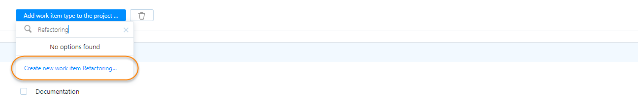 To add a new work item type, enter a name in the input field and select the Create new work item option.