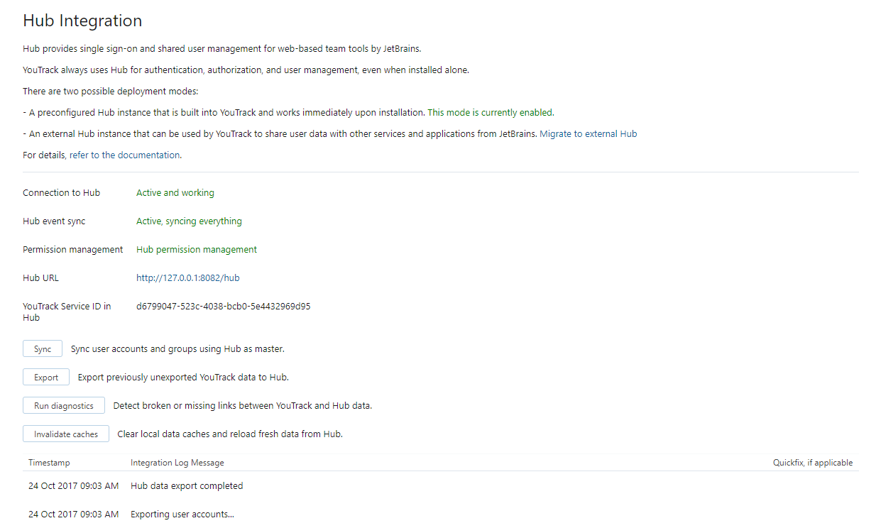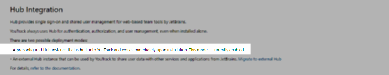 If you're wondering which mode is currently enabled in your YouTrack installation, check this section of the page. You can also use this information to verify whether your migration to an external Hub service was successful.