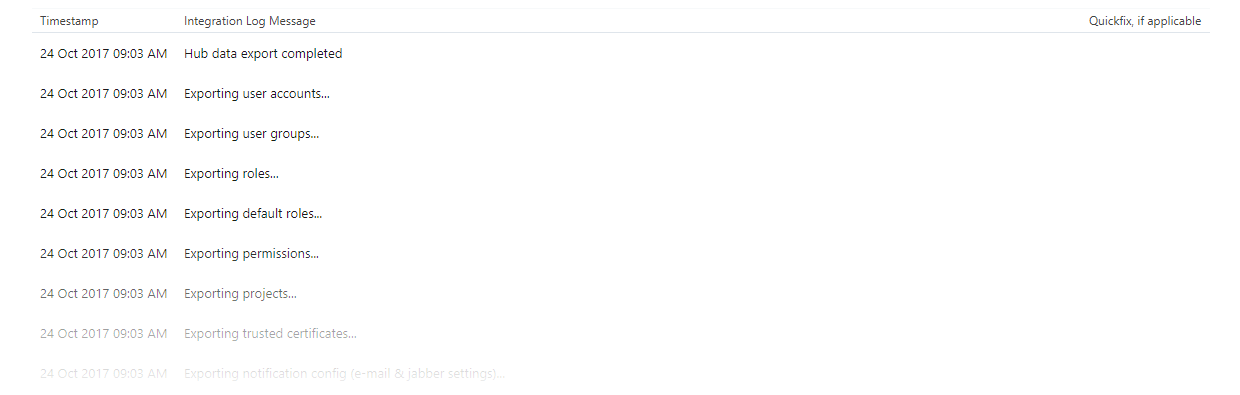 At the bottom of the Hub Integration page, you find a list of recent events that have been written to the integration log.