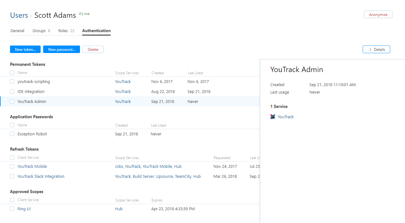 In YouTrack Standalone, permanent tokens allows developers to access and perform operations securely via REST API calls in their scripts and applications without implementation of more complicated OAuth 2.0 authentication flows. A permanent token allows access to YouTrack instance with the permissions that are assigned to the user account with generated it.