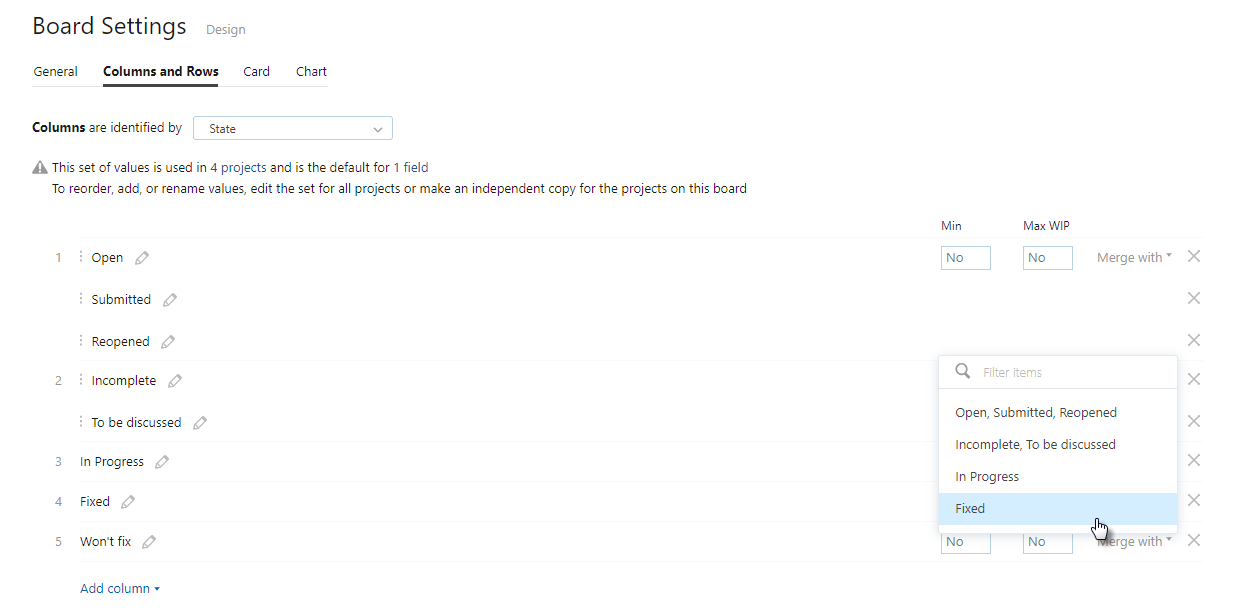 The merged columns feature lets you put cards with different states into one column. For example, merging columns lets you put open and submitted cards in the same column.
