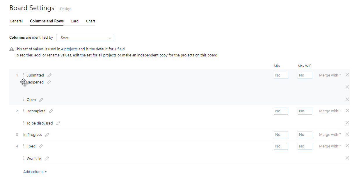A new column value is added to the merged column. You can drag the column values to reorder them. The order of values in a merged column affects the automatic assignment of the field value when you drag cards on the board.