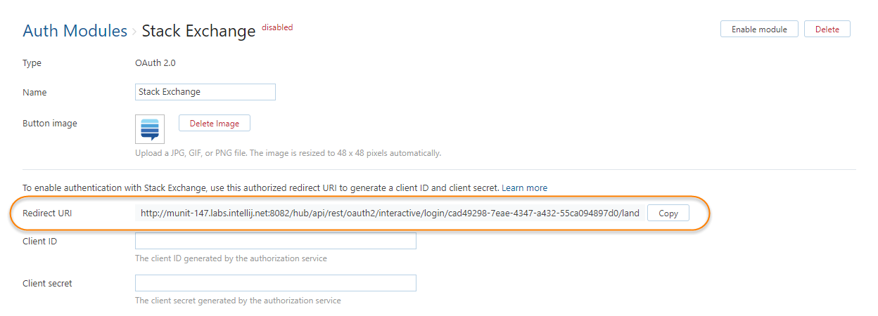 When you create an OAuth 2.0 authentication module, YouTrack generates a redirect URI to use with the authorization service.