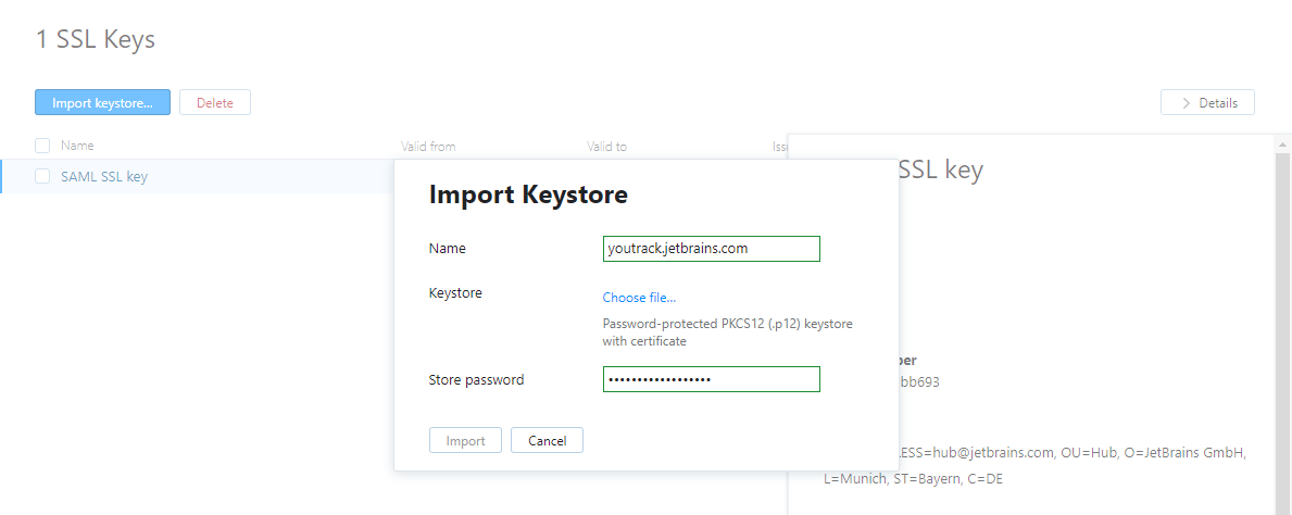 YouTrack lets you import SSL keystores into YouTrack. A keystore is a container for public and private key pairs and the certificates that they are associated with. The keystore identifies YouTrack as a client when it tries to connect to a third party.