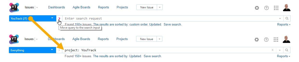 By default, the context is set to Everything. In this context, a search query returns all issues in YouTrack that are available to you.