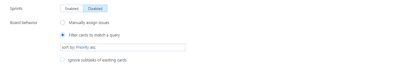 This option gives you the most control over which issues are managed on your board. If you choose the option to filter cards to match a query instead, you can still add issues manually to the board.