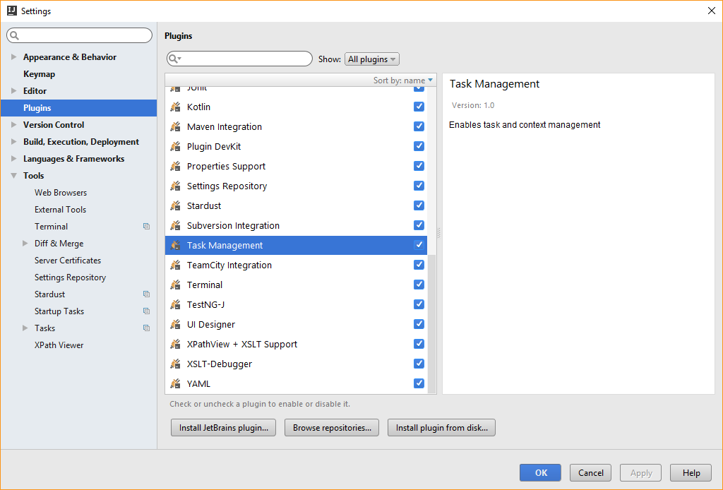2. Open the Settings dialog and select Plugins. Verify that the Task Management plugin is enabled.
