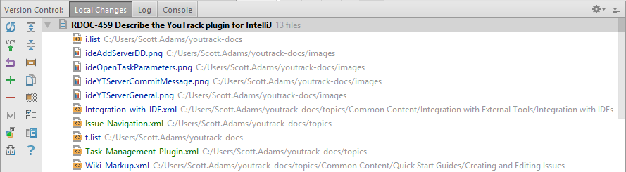 The Task Management plugin lets you open a YouTrack issue as a task in your IDE. This sets the YouTrack issue as the current work context. Changes to the code base are added to a change list that is associated with the issue.