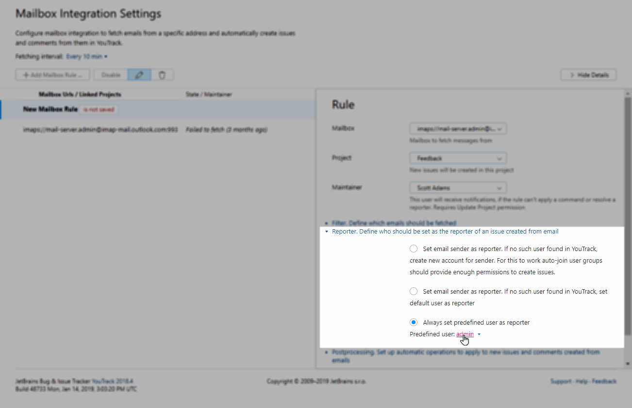 Select the Always set predefined user as reporter option and select the predefined user to set as the reporter for all issues that are created from incoming email messages. This option guarantees that YouTrack does not create a user account for each new customer who sends a support request.