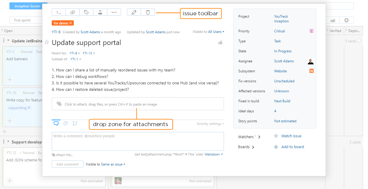 Add attachments | To attach one or more files to an issue, drag files to a card on the board. The card itself becomes a drop zone. |