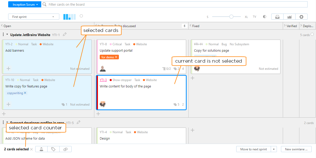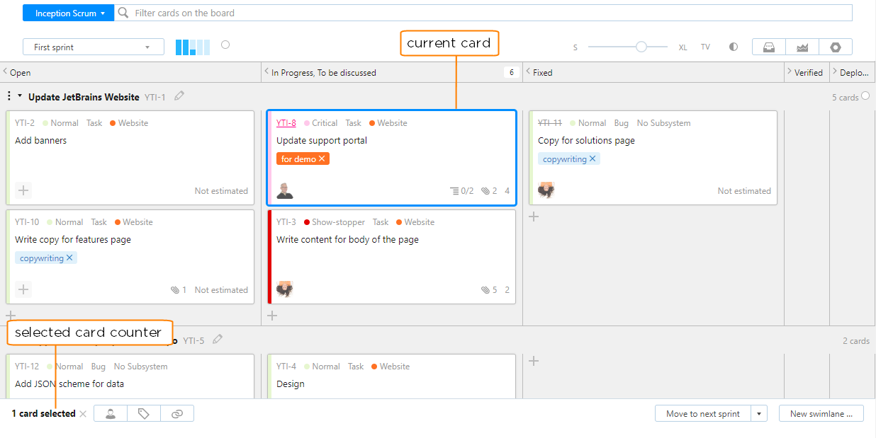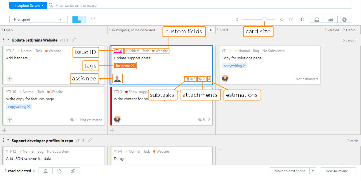 The first thing you'll notice is that issues are transformed into interactive cards that you can move around the board. When you move a card to another position on the board, the values that represent the new column or swimlane are updated in the fields that identify these positions on the board.