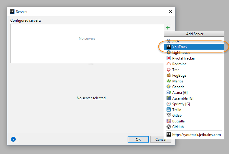 Click the Add server button and select YouTrack.