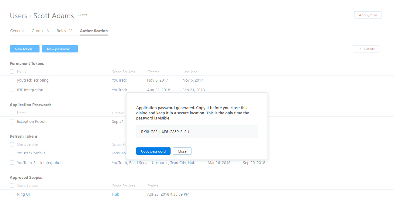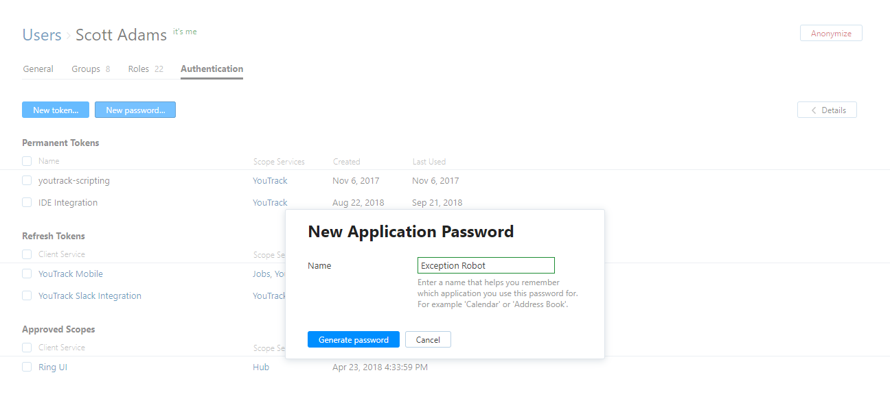 As an example, the YouTrack Mobile app asks for your username and password when you set it up. This gives the app permission to use your Hub account to access issues in YouTrack. If you have enabled 2FA for your Hub account, you can't log in through the app with your username and password. Instead, generate an application password for YouTrack Mobile and log in with your user name and the application password.