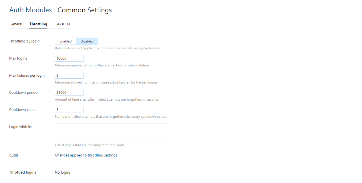 When the Throttling option is enabled, there are additional settings that manage how throttling is applied to logins and requests to verify credentials.