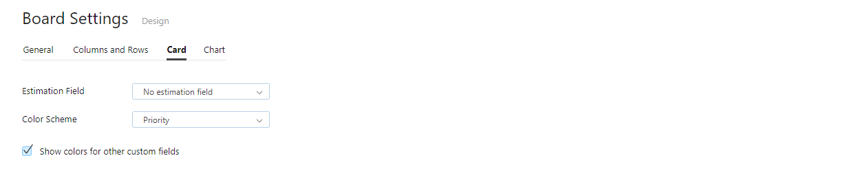 Here, you don’t have the option to set the default issue type for new cards. That’s because the swimlanes are identified by assignee. The Color Scheme for cards is based on the set of values for the Priority field.