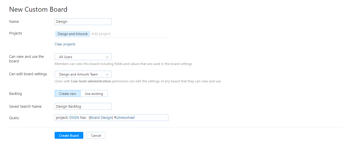 For the Backlog option, choose Create new. You won’t do anything with it to support this use case, but you need a backlog to create the board.