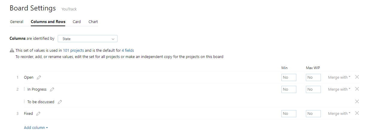 - On our board, columns are identified by values from the State field. We have separate columns for: