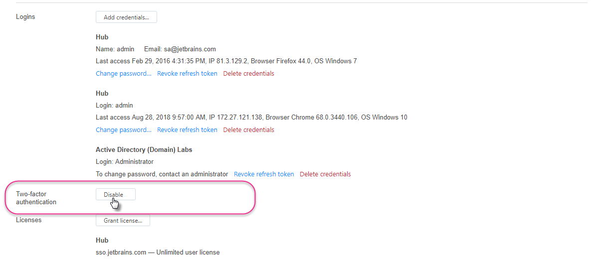 Users can enable two-factor authentication by pairing their Hub account with an authentication app. YouTrack provides recovery codes that can be used as one-time passwords to access the application. If a user doesn't have the recovery codes and no longer has access to the authentication app that is paired with the Hub account, he or she is unable to log in.
