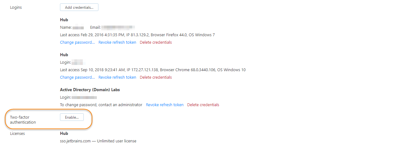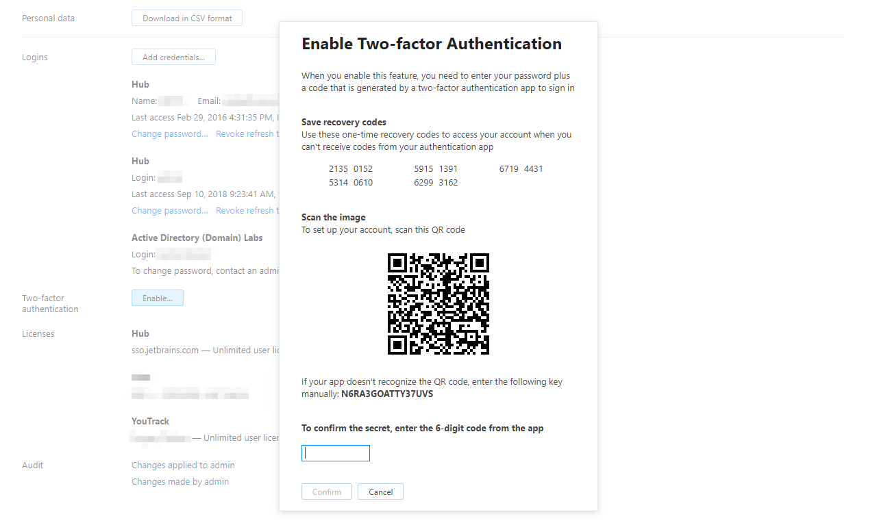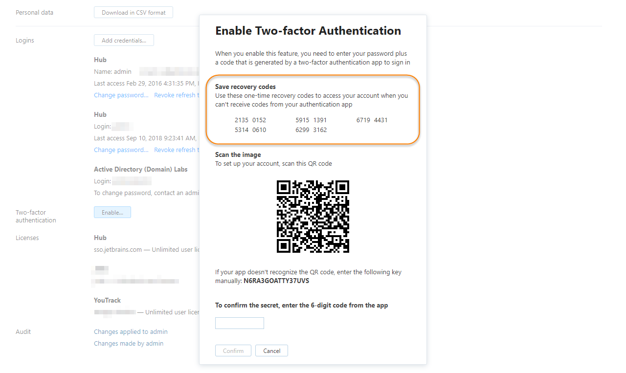 YouTrack provides recovery codes that can be used as one-time passwords to access the application. If you no longer have access to the authentication app that is paired with the Hub account (for example, you lose your mobile phone or reset the device), you can use one of your recovery codes to log in.