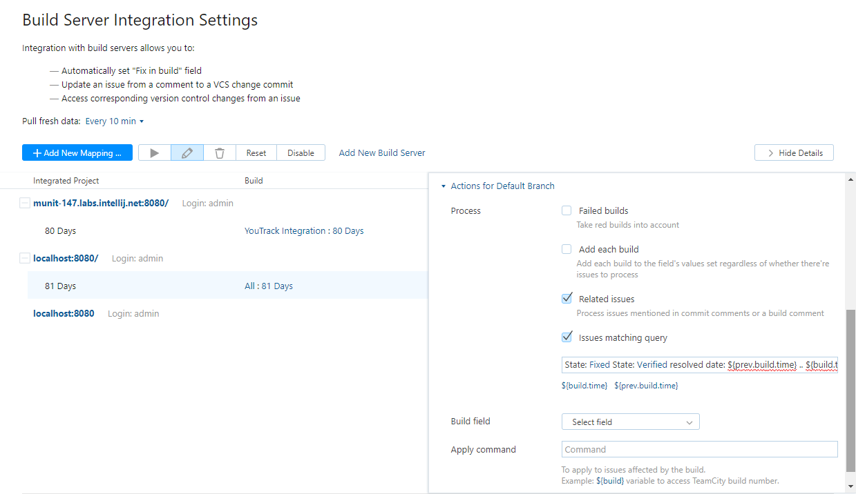 The first group of settings connect YouTrack to a job for a project on a Jenkins server. Additional options for the default branch let you define which issues are assigned build numbers. You can also specify the commands to apply to all of the issues that are processed by YouTrack.
