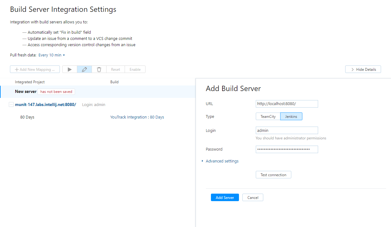 To enable the integration, you need to connect to one or more Jenkins servers. This operation can also be performed by a project administrator on a per-project basis. For more information, see Integrate with Jenkins.